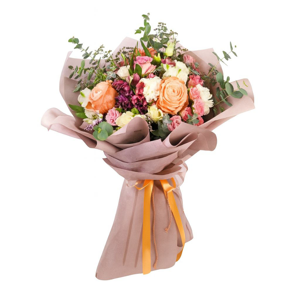 Ovaj nježni buket sastoji se od ruža, lizijantusa, alstromerija, statica, karanfila te zelenila.