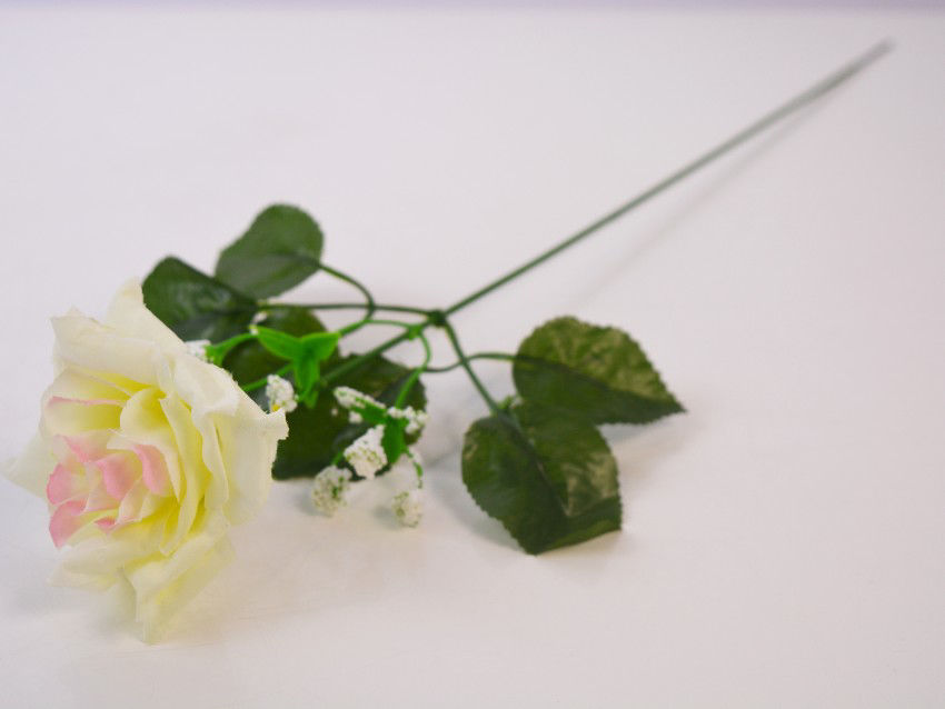 Umjetna ruža koja se sastoji od savitljive stabljike, malih zelenih listova i unikatnog cvijeta.