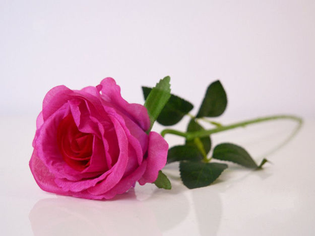 Prekrasna umjetna ruža koja se sastoji od realistične stabljike, zelenih listova i savršenog cvijeta u boji ciklame.