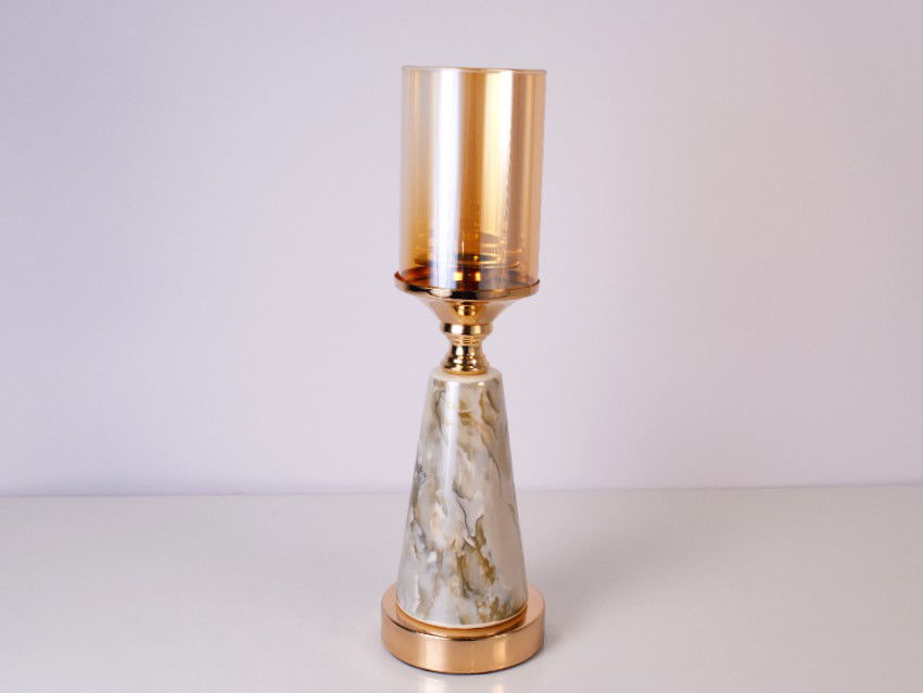Zanimljivi metalni svijećnjak sa staklenim vrhom. Zlatna i zemljane boje te mramorni uzorak