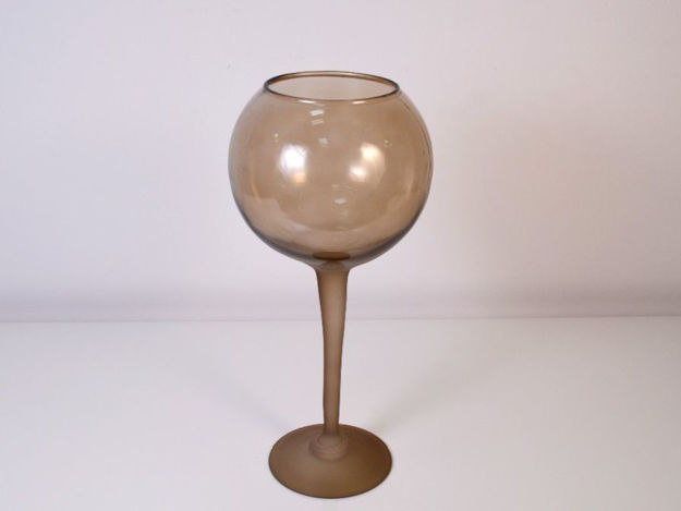 Smeđa staklena vaza na stalku. Neobičnog i zanimljivog oblika sa manjim vrhom koji se sa minimalno